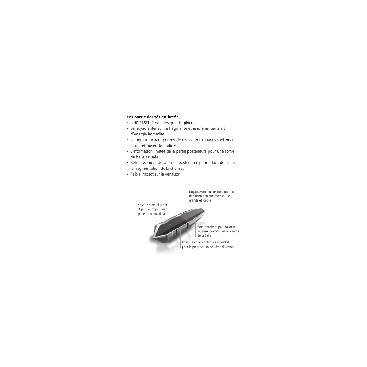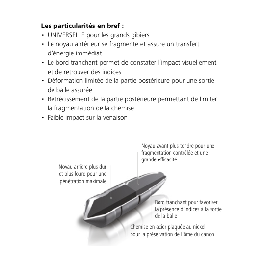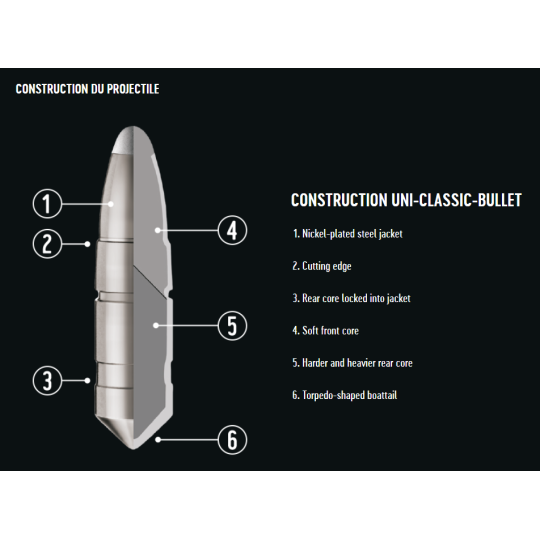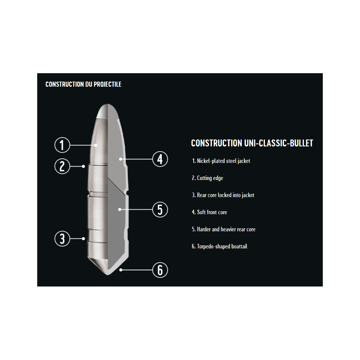 Elle se distingue par sa balle à ogive Uni classic tendue, alliant puissance et pénétration.
