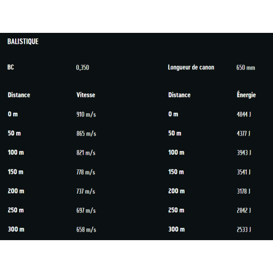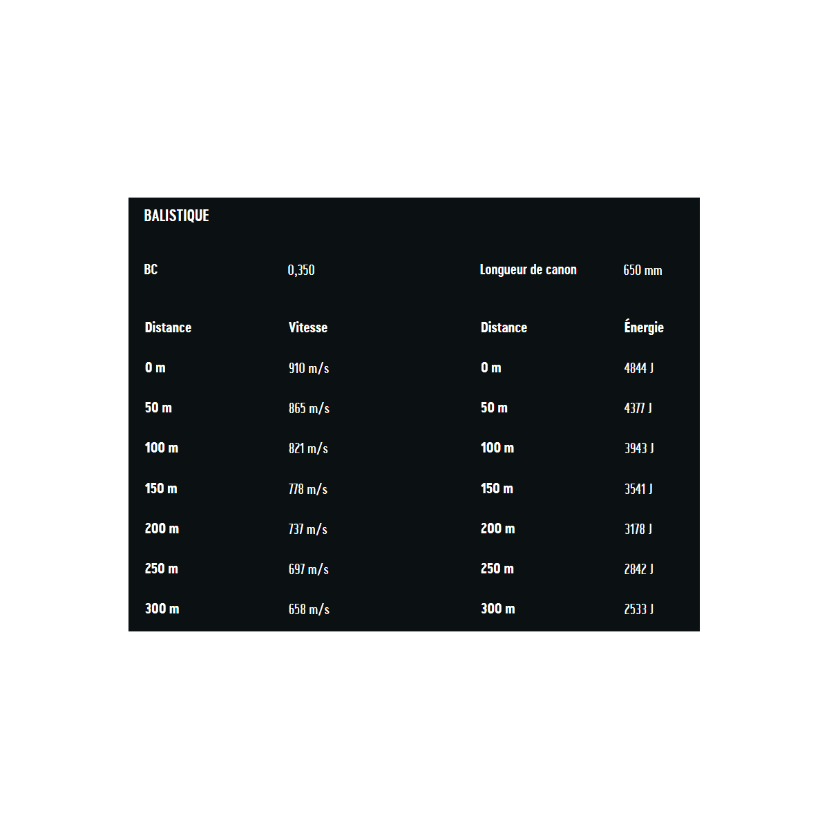 Avec une vitesse de départ de 940 m/s et une énergie de 5 169 joules, elle offre une performance exceptionnelle sans déviation notable à 100 mètres.