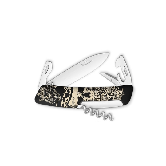 Le SWIZA D03 DIA DE LOS MUERTOS (ZD03DIA) est un couteau multifonctionnel qui célèbre la thématique du Dia de los Muertos, avec une manche noire et une lame blanche de 75 mm en acier 440C. Il intègre 11 fonctions pratiques, dont un tire-bouchon de qualité sommelier et un système de blocage de sécurité Liner Lock.