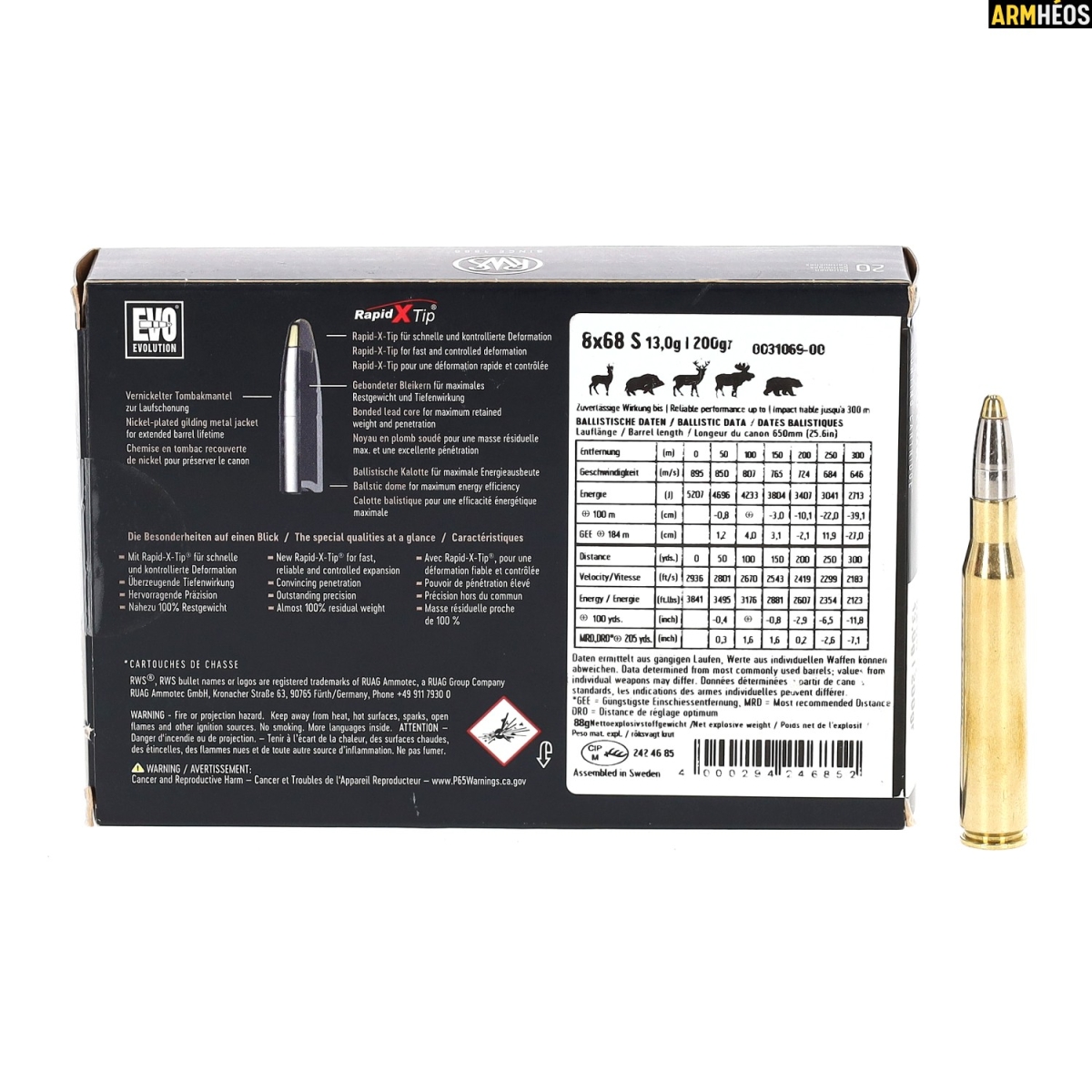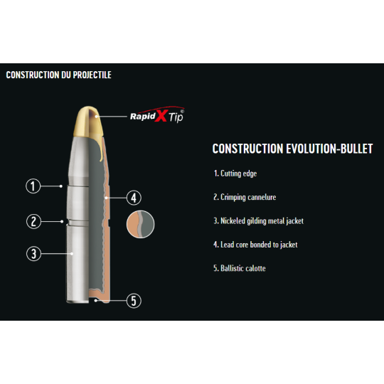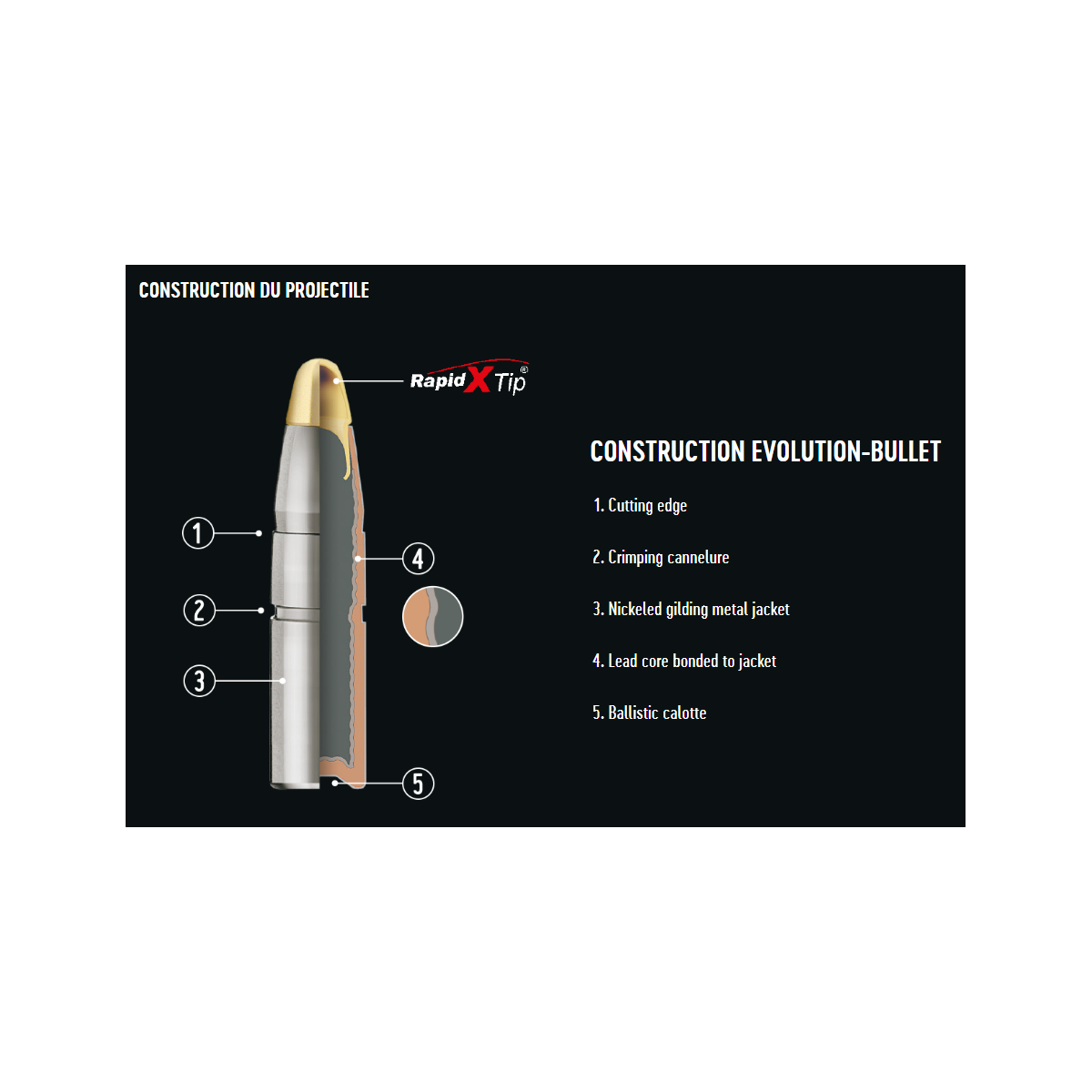 La balle RWS Evolution en calibre 8x68 S EVO de 13g est une munition hautement performante pour la chasse. Elle présente des caractéristiques innovantes pour une efficacité à toutes distances :