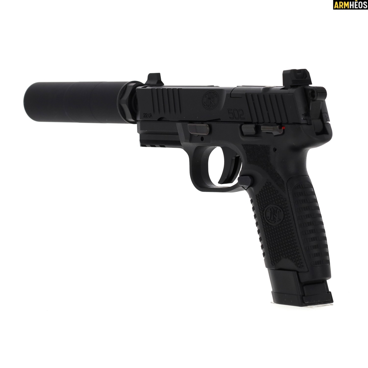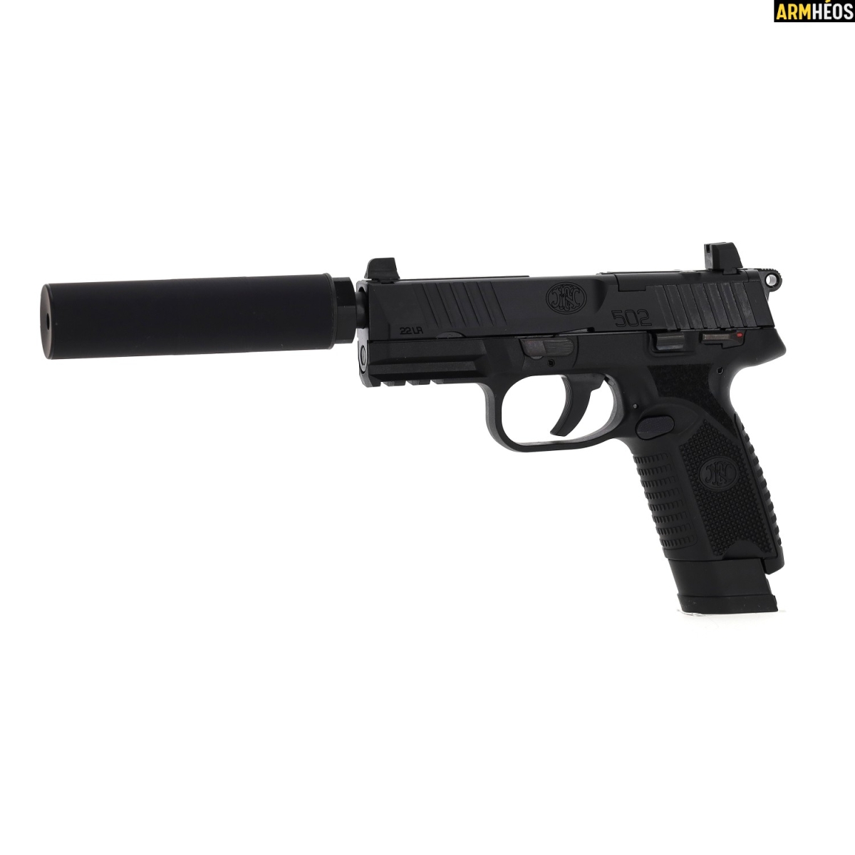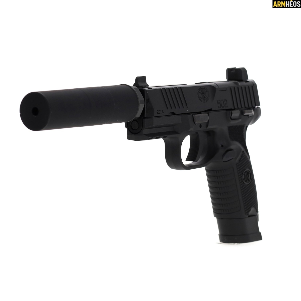 Le FN Herstal 22 LR FN 502 Tactical Noir Optic Ready avec modérateur de son Iridium est un pistolet semi-automatique conçu pour offrir un plaisir de tir de loisir sans se ruiner, avec son look tactique, capable de recevoir pleins d'équipements tels que point rouge, lampe, réducteur de son, etc. C'est une plateforme à chien externe, en simple action. La détente est légère et franche.