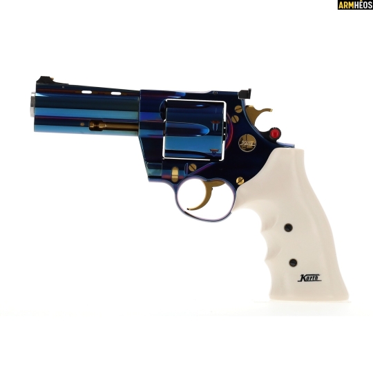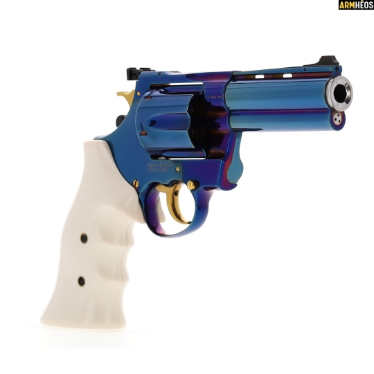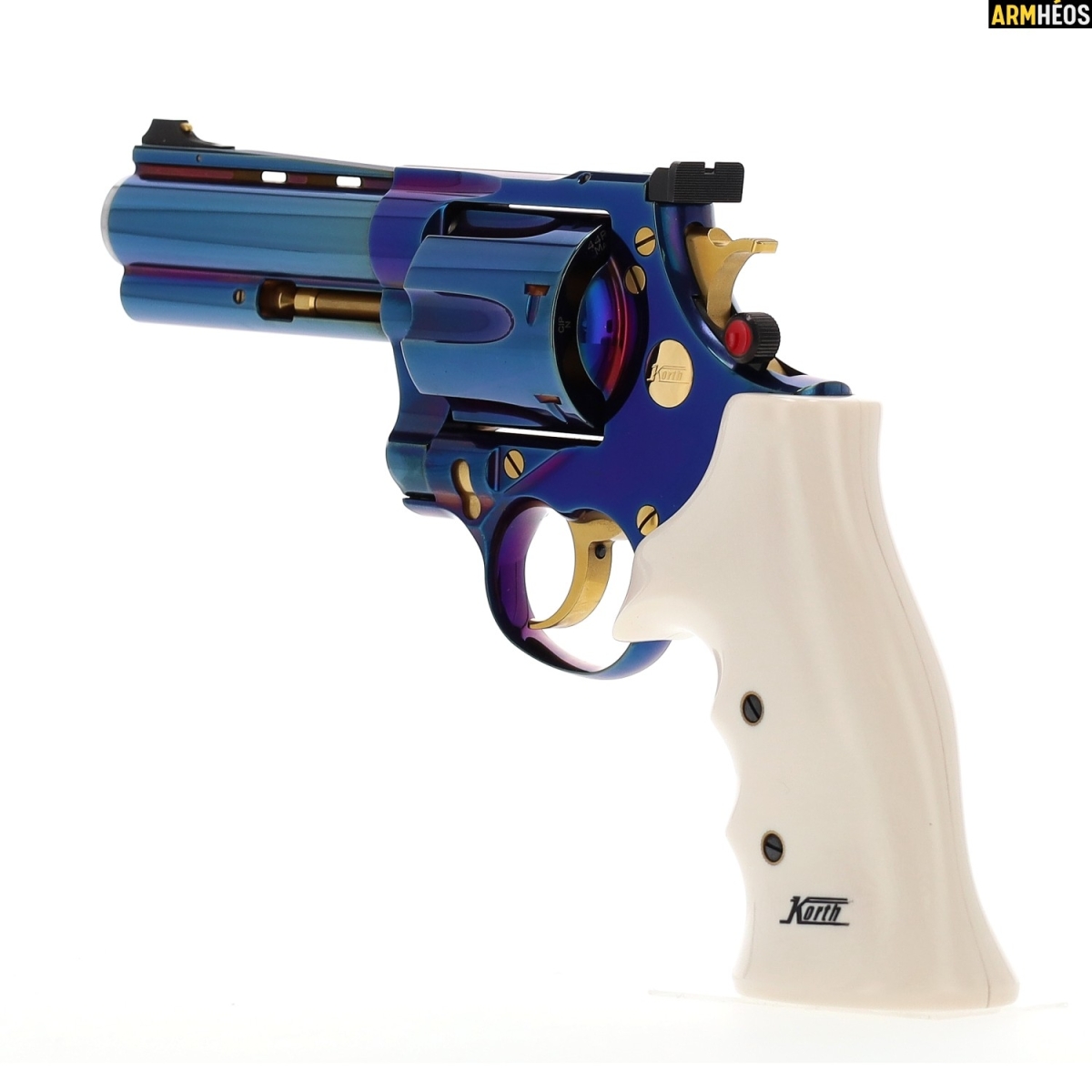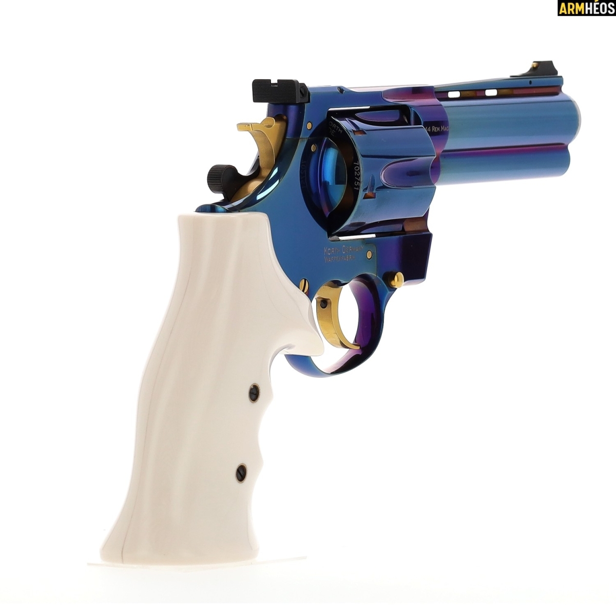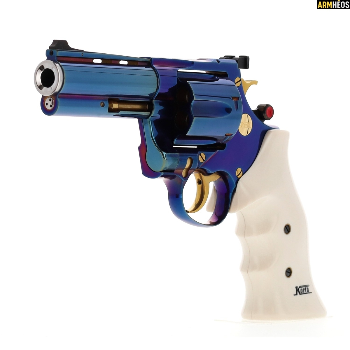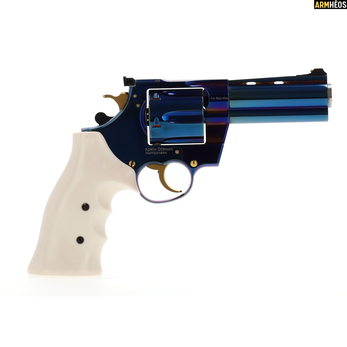 Le Revolver Korth Classic 44 Mag 6" Plasma Bleu Poli est une pièce d'exception en calibre .44 Magnum avec un canon de 4 pouces, offrant une finition bleue plasma éclatante et plaquettes de crosse "type ivoire".